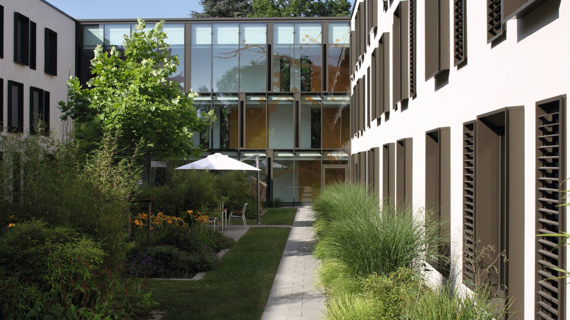 Es gibt zahlreiche Best-Practice-Beispiele, die im Zusammenspiel mit der Natur Hingucker und Wohlfühlinseln schaffen, damit die Umgebung eines Unternehmens kühlen und idealerweise zum Schwamm für starke Regenfälle machen. In Kliniken sind sie jedoch eher die Ausnahme als die Regel. Allen gemeinsam ist nämlich: Die Pflege üppig bewachsener und gestalteter Flächen ist aufwendiger als der Unterhalt glatter, voll versiegelter Umgebungen.