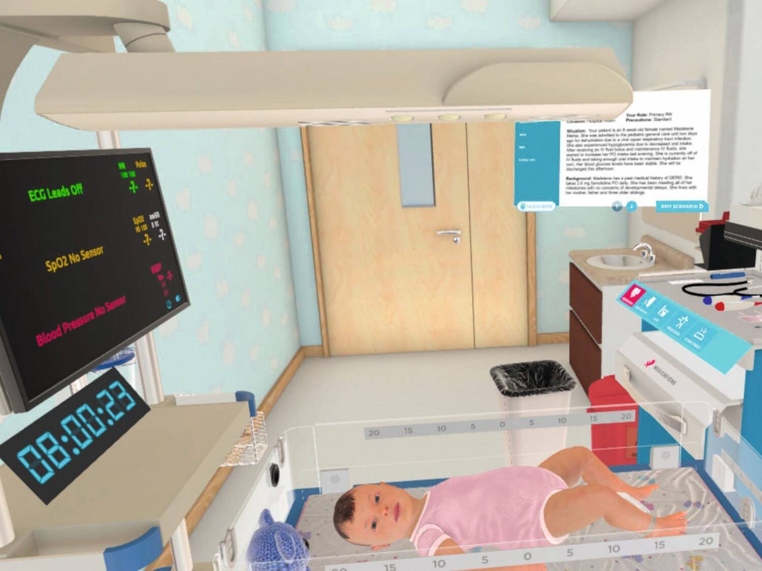 In dem virtuellen Patientenzimmer findet sich alles Notwendige: ein höhenverstellbares Patientenbett, ein Sauerstoffanschluss, ein Medikamentenanschluss, Infusionen und ein Blutdruckmesser. Auch ein Stethoskop liegt bereit. Wenn der Patient Asthma hat, kann damit die Lunge abgehört werden. Bei einem simulierten Asthmaanfall ist ein Geräusch zu hören. Ebenso können die angehenden Pflegekräfte den Puls messen, der Herzschlag ist über den Controller spürbar. Über dem Bett befindet sich die Patientenakte. Darin stehen alle notwendigen Daten, inklusive der konkreten Lernaufgabe. Der Lehrer schaltet sich per Laptop dazu und sieht aus der Vogel- perspektive zu, was die Auszubildenden machen, gibt Hilfestellungen und Anweisungen.