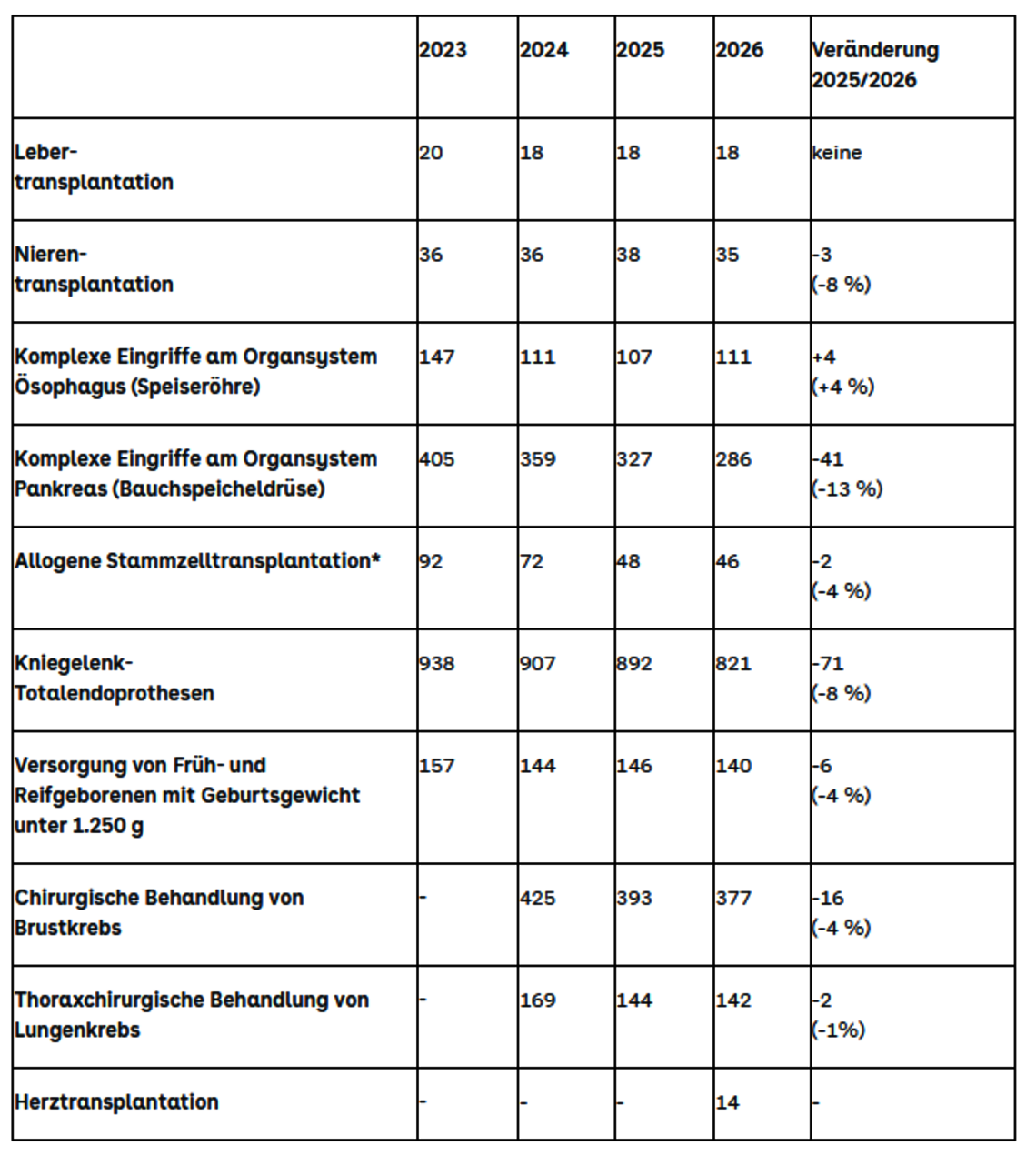 Die Mindestmengen werden vom G-BA festgelegt und regelmäßig überprüft. Im Jahr 2026 gelten Mindestmengen für die Implantation von künstlichen Kniegelenken (50 Fälle pro Jahr), Transplantationen von Leber (20), Niere (25) und Stammzellen (40), komplexe Operationen an der Speiseröhre (26) und an der Bauspeicheldrüse (20), die Versorgung von Früh- und Reifgeborenen mit einem Aufnahmegewicht von unter 1.250 Gramm (25), Brustkrebs-Operationen (100), thoraxchirurgische Behandlungen von Lungenkrebs (75 Fälle) sowie für Herztransplantationen (10 Fälle pro Jahr).